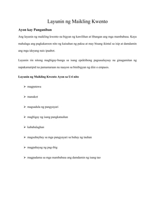 Kaawaan Maunawaan Pang-alis ng kamangmangan Nadikit Malirip Kaabaan Napatda Patighaw sa kauhawan Alamin ang kahulugan ng mga sumusunod na salita. B Y X 2 Ang Kwento ni Mabuti g m 1 Mariel S. Banghay sa kwento ni mabuti by genoveva edroza matute - 1664804 Ang Kwento ni Mabuti Panimula- Ang paglalarawan ng tagapagsalaysay sa kasalukuyang kalagayan o ang kasalukuyang kinaroonan ni Mabuti ang kanyang dating guro.
