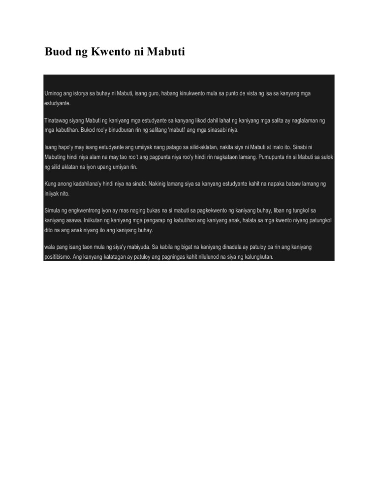 Kwento ni mabuti pagsusuri Published by on January 27 2021 on January 27 2021. Introduksiyon Ang Kuwento Ni Mabuti ay isang maikling kuwento sa wikang Tagalog na isinulat ng Pilipinong makata na si Genoveva Edroza Matute. Ito ay tumatalakay sa buhay ng isang guro na kung tawagin ng kaniyang mga estudiyante ay Mabuti sapagkat sa bawat araw na siyay nagtuturo lagi niyang bukambibig ang salitang Mabuti.