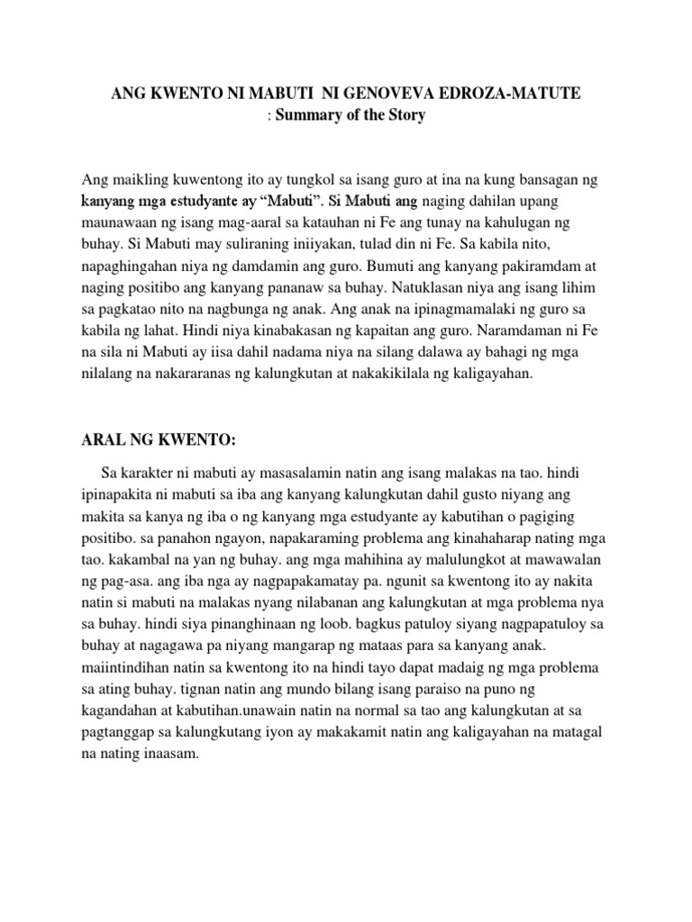 It is all about the life of a teacher named Mabuti and how she handles the problem as a teacher and mother to her child. Sa isa sa mga lumang silid sa ikalawang palapag sa itaas ng lumang hagdang umiingit sa bawat hakbang doon sa kung. Tema at Paksa ng Maiikling Kwento.