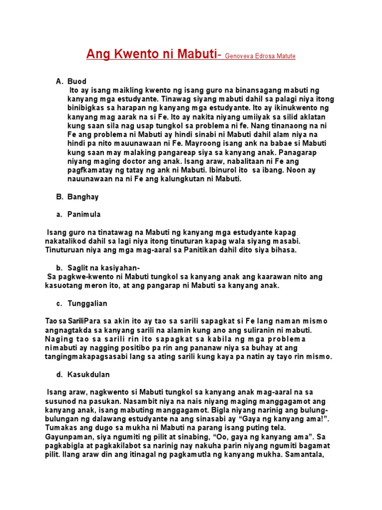 Buod ng Maiikling Kwento. Anu ang kakalasan sa kwento ni mabuti. Sa kwetoy makikitang kahit may pagaalinlangan ang babae sa kung ipagpapatuloy pa ba niya ang kaniyang dinadalang bata ay di pa rin niya binitiwan ang.