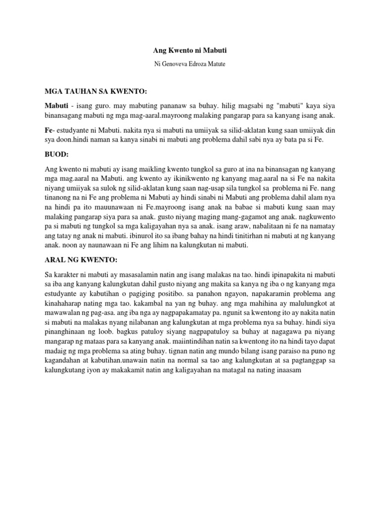 Lantad man nating makikita sa pamagat ang tauhan sa ating kwento buong pagkataoy nitoy tiyak na nakatago at kakatwa sa bawat isa. At higit sa lahat Mabuti ang naging palayaw niya dahil hilig niyang sambitin ang mabuti sa kaniyang mga pahayag. Pahina 1 ng 5 Kwento ni Mabuti Pagsusuri ni.
